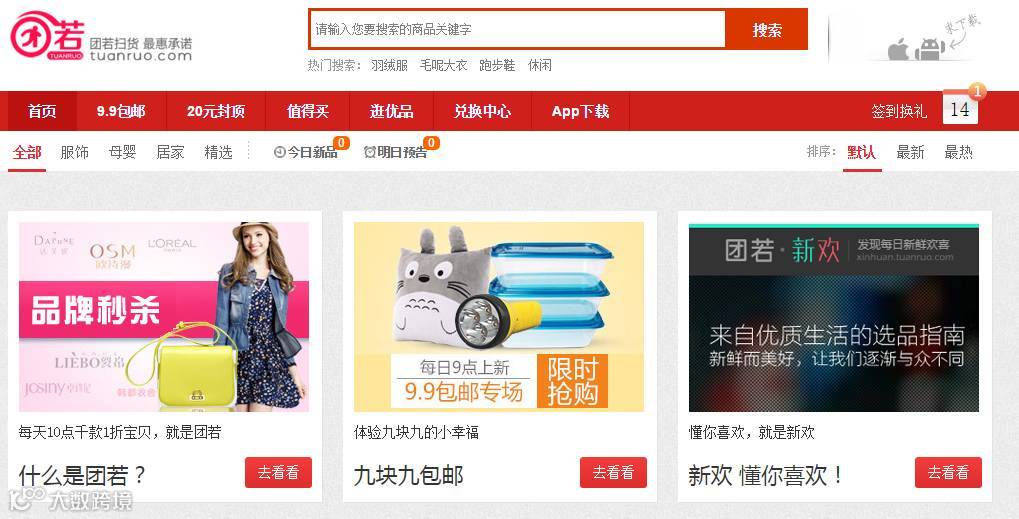 确定这个网站还没有倒闭?点进官网看了看,虽然介绍团若的视频和文章有不少,可是里面的文章都是2014年的,没有更新,而且网站上的九块九包邮页面点进去却是返回主页,主页上的商品也很少。而且,里面的商品点进去就是直接到达淘宝,这不就是“什么值得买”吗?而且,重点是团若里面的商品都是比较low的东西,没有牌子,质量难以保证。