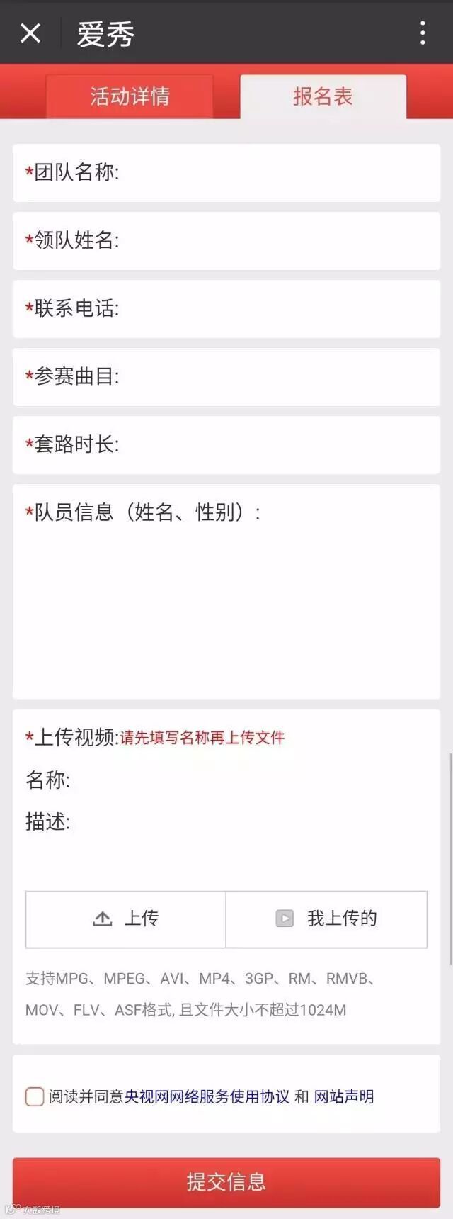 1.参赛舞队领队(或指定队员之一)登陆大赛网络平台填写报名信息并上传参赛视频。