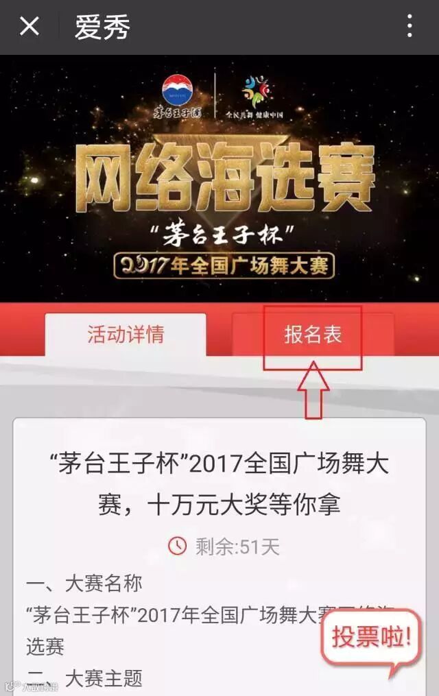 1.第一阶段赛事采取微信网络投票方式,根据投票人气排名。各队完成报名和上传后,将视频页面分享到微信中即可让好友为你投票。