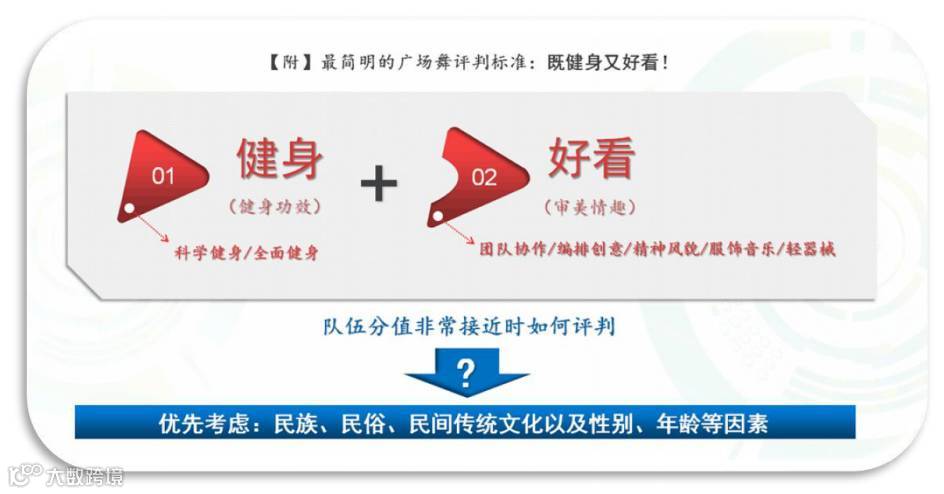 根据这个标准,我们就知道如何对一支广场舞参赛队进行评判了。