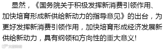 在该文件的第三部分“消费升级重点领域和方向”之“绿色消费”描述时,明确把“净水器”作为绿色消费进行强调,具体内容为:生态文明理念和绿色消费观念日益深入人心,绿色消费从生态有机食品向空气净化器、净水器、节能节水器具、绿色家电、绿色建材等有利于节约资源、改善环境的商品和服务拓展。