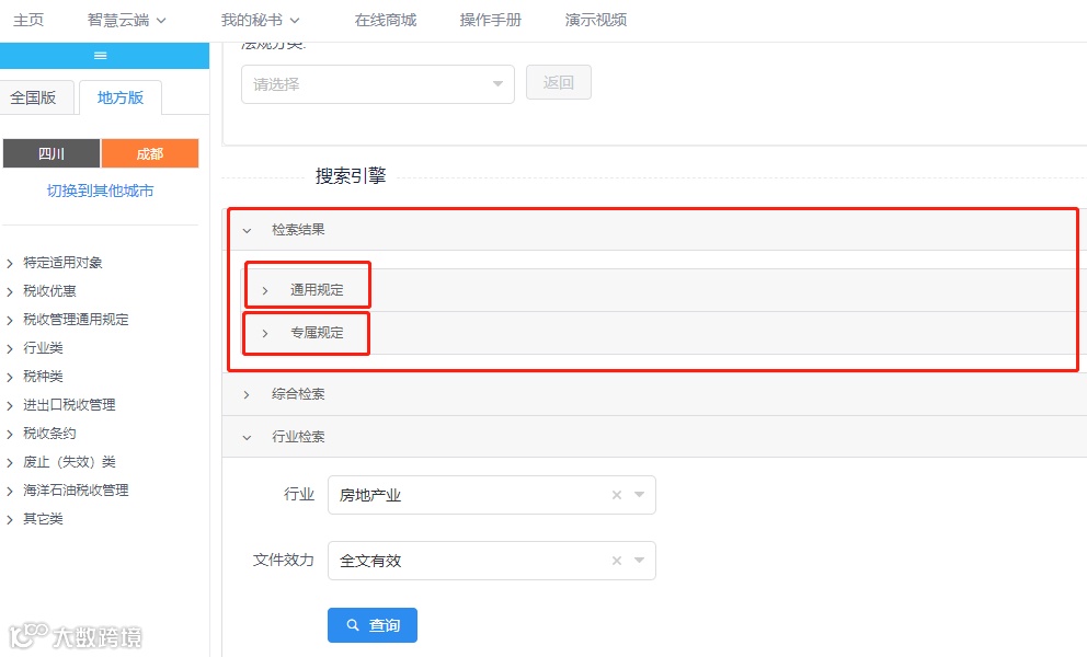 点击查询后,我们可以看到检索结果中出现了通用规定(所有行业都适用的税收政策)和专属规定(所要查询行业独有的税收政策)。