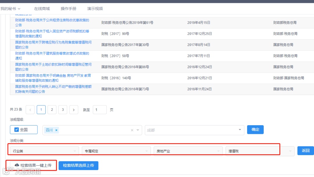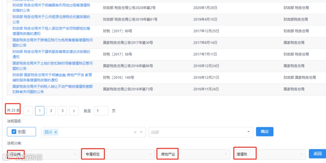 第一种方式:我们可以在在房地产行业中的通用规定和专属规定下按税种分类选择——增值税再次检索,得到该房地产企业关于通用的增值税政策(中央、四川省级、成都市市级)有178条。得到该房地产企业独有的增值税政策(中央、四川省级、成都市级)有23条。