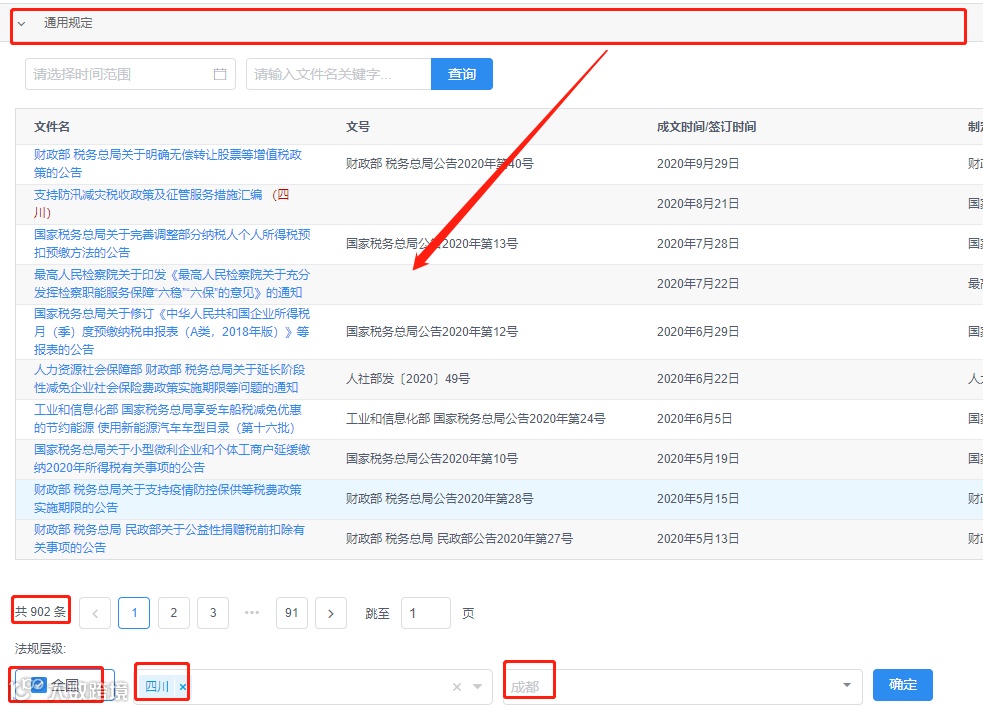第三步:打开通用规定,选择在法规层级中依次选择全国——四川——成都,然后点击确定,这时候检索出来的结果就是所有行业都适用的中央政策、四川省级政策、成都市市级政策,我们可以看到是902条税收政策(全文有效)。