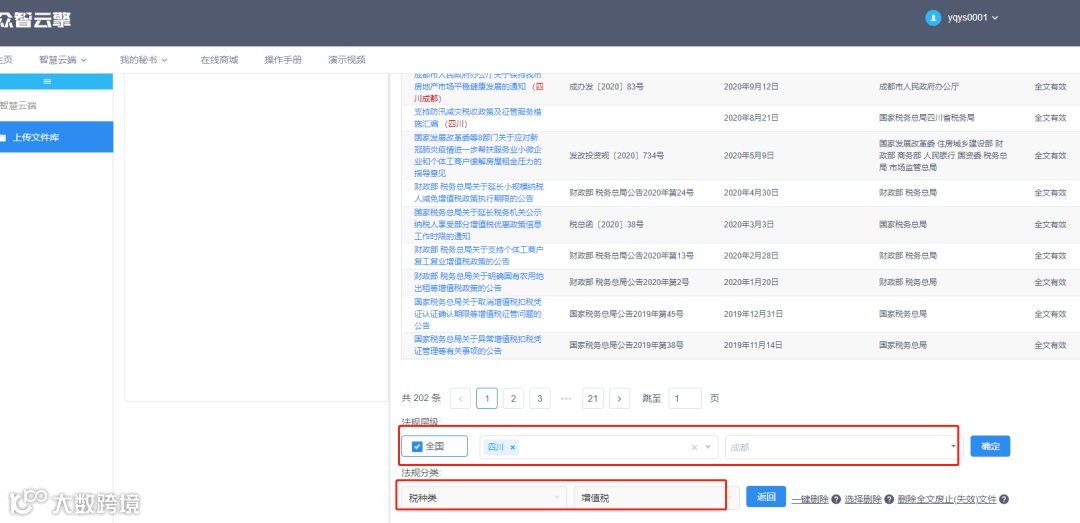 在智慧云端中该房地产企业的1092条税收政策(全文有效)按照税种分类选择——增值税检索,即可得到这家四川省成都市的房地产企业所适用的增值税政策(中央、四川省级、成都市级)一共是201条(全文有效)。