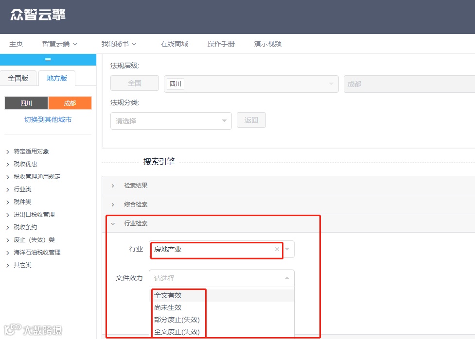 假如,我们要查询:四川省成都市的一家房地产企业所适用的全部政策。