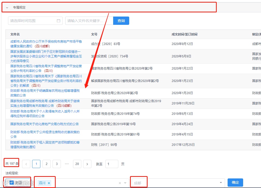 第四步:打开专属规定,选择在法规层级中依次选择全国——四川——成都,然后点击确定,这时候检索出来的结果就是房地产行业独有的中央政策、四川省级政策、成都市级政策,我们可以看到是197条税收政策(全文有效)。
