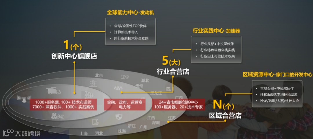 “1+5+N”是鲲鹏计算2021年打造的立体化、多功能生态服务平台,三者互相促进、联动发展,1个超级旗舰店赋能5大行业中心和区域中心,5大行业中心和区域中心将聚焦的行业优势和本地优势案例信息反馈到旗舰店,再通过旗舰店赋能全国形成正向循环。