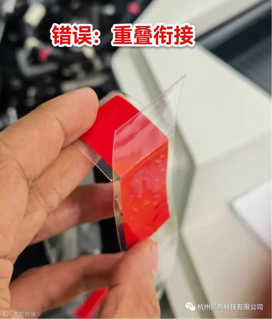 4、装上新胶带盒,将两根胶带对应粘贴(注意:对接粘贴胶带,最好两个断面正好对接,不要留间隙,也不要重叠。留间隙大了,红色胶布容易粘住环导致卡,重叠多了,变厚胶带转弯时容易卡住。)