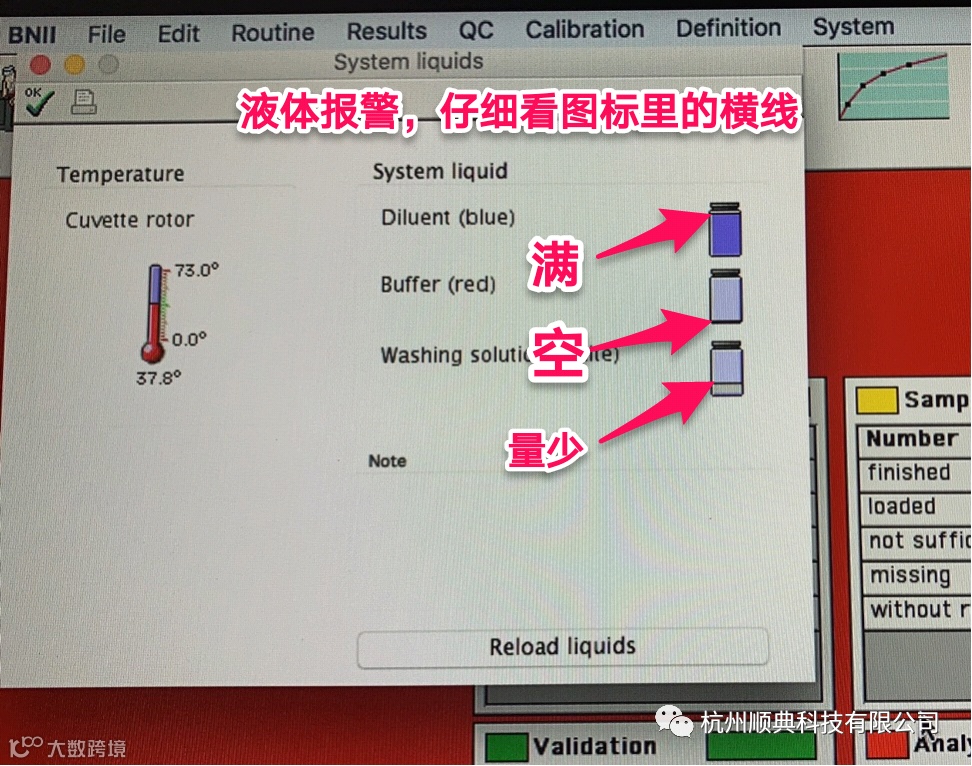 BNII液体耗材报警,不注意看会不知道是哪个报警。要注意看图表,不用状态的图标显示是不一样的。(