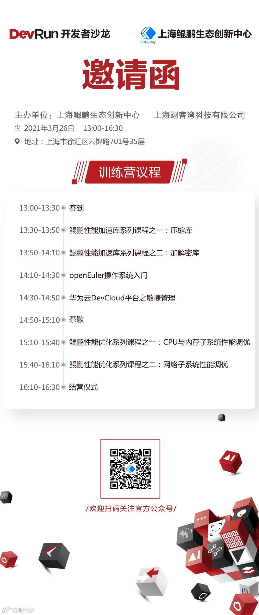 2021年3月26日,DevRun开发者沙龙鲲鹏开发者训练营第二期将在上海鲲鹏生态创新中心举办,本次沙龙将邀请华为鲲鹏计算领域的资深专家为开发者带来鲲鹏性能加速库、openEuler操作系统入门、华为云DevCloud平台之敏捷管理和鲲鹏性能优化等众多精彩内容。