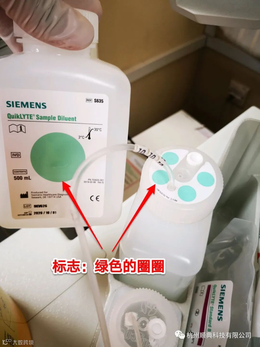 杭州顺典科技有限公司1、Dimension耗材里有一个试剂探针洗液和电解质的稀释液瓶子大小一样,稍有不注意就有可能拿错,所以换稀释液(Diluent)的时候最好核对一遍。