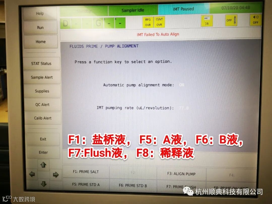 2、电解质耗材中A液、B液、Flush液都是透明袋子,能很明显看到量,一般不会用到完全没有。但是稀释液和盐桥液是瓶子的,有可能存在完全用空的情况,正常用空仪器会有报警,如果用空后更换一定要做灌注,灌注3次以上,这样能保证管路里的空气完全排出。(灌注界面:F4F3F3)