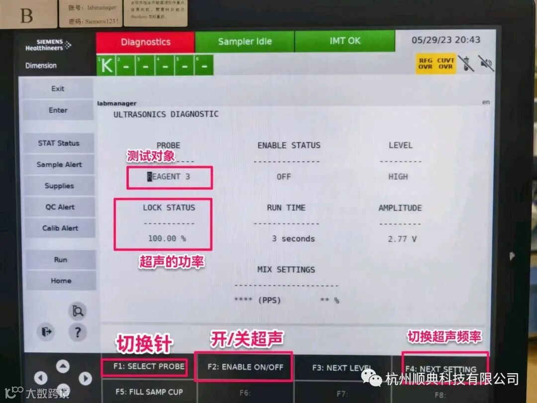在测试超声界面:按F1:SELECT PROBE选择要测试的针——用样本杯装上水,将针头放入水中——按F2:ENABLE ON/OFF开启超声——按F4:NEXT SETTING切换超声频率。(每个超声有三个频率,三个频率的超声功率都能达到100%才是正常)