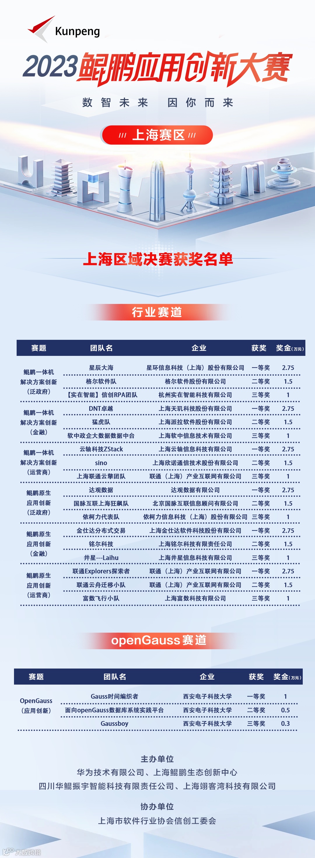 上海赛区入围全国半决赛名单公示如下,接下来,各个赛题Top2团队将作为上海赛区代表参与全国半决赛的激烈角逐。