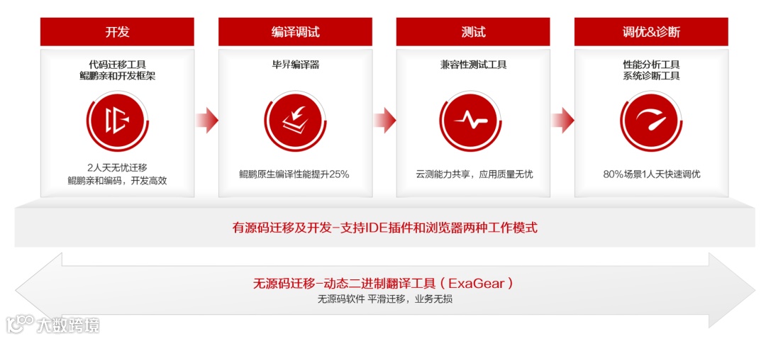 在各行业基于鲲鹏计算产业生态加速数字化转型的道路上,由传统架构向鲲鹏平台的软件迁移、以及基于鲲鹏平台的原生开发都是非常关键的环节。为了帮助开发人员更快熟悉鲲鹏平台,更加便捷、高效地完成不同计算平台之间的应用迁移,鲲鹏在2019年面向合作伙伴和广大开发者发布了一站式开发套件DevKit1.0,覆盖有源码与无源码两大场景下的无忧迁移:针对源码应用,提供代码迁移、编译调试、性能分析、系统诊断等工具套件,确保应用的快速迁移以及迁移之后的性能最佳;针对部分找不到源码的存量应用,通过动态二进制指令翻译软件ExaGear,“零代码”、“低损耗”的实现应用迁移。
