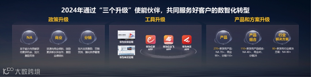 产品和方案升级:我们将新发布270+产品,110+产品组合,80+行业解决方案,使能伙伴快速构建,基于华为领先产品和解决方案的技术能力,帮助客户更便捷的获取数智化技术,获得商业成功。