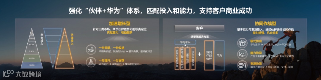 模式协同:从以华为主导的作战模式,扩展到华为主导,加联合协同作战型伙伴两类模式,共同拓展和交付项目,为客户提供更多更好的场景化解决方案;