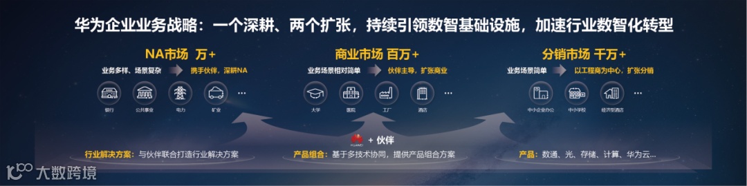 在全球数智化转型的大趋势下,不同行业、不同规模客户的转型进程不同,需求也存在差异。为了更好满足不同客户的数智化转型需求,我们面向NA、商业、分销三类市场制定了差异化的业务战略,坚持“一个深耕、两个扩张”,即,深耕NA市场,扩张商业市场和分销市场,通过深入理解客户需求和持续技术创新,提供领先的产品、产品组合和行业解决方案,来加速各行业的数智化转型。