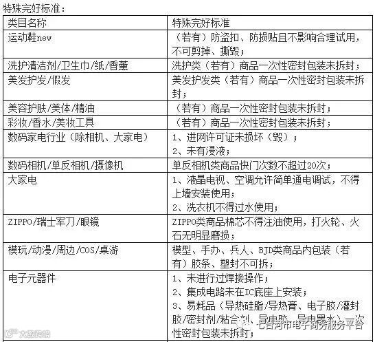 此外,规则要求买家退回商品应当保持“完好”,并明确“商品完好”的通用标准和类目特殊标准。其中,美妆、护肤品、图书杂志、动漫周边、游戏软件、保健品药品等类目,(若有)一次性密封包装拆封后就不再遵循“7天无理由退换”规则;大家电类目的商品。