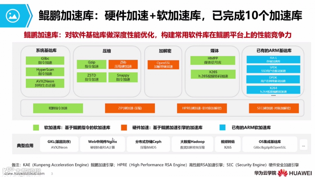 鲲鹏计算加速库对软件基础库做深度性能优化,构建常用软件库在鲲鹏平台上的性能竞争力,包括硬加速和软加速两部分。鲲鹏加速库专家介绍,硬加速引擎通过CPU的硬件基础特性做加速,上层应用基于OpenSSL/zlib加速库调用鲲鹏加速引擎,并通过寄存器操作调用芯片加速子系统。软加速是一系列基础软件的组合,每个软件的加速方案和修改策略不同,主要包括Glibc 、Hyperscan 、AVX2Neon、Gzip 、Snappy、ZSTD、HMPP、X265等基于鲲鹏指令的软加速库。