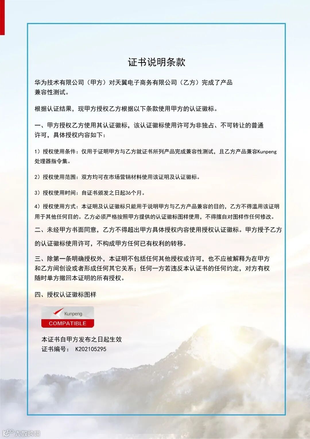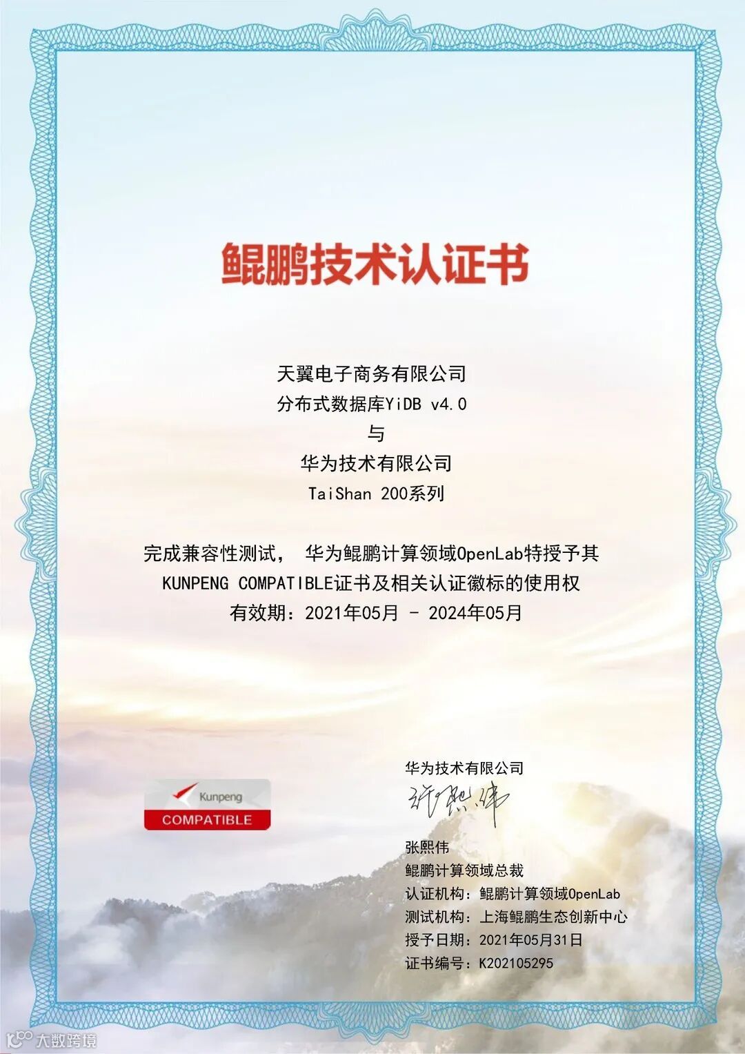 天翼电子商务有限公司的“国产分布式数据库YiDB”产品,完成了与华为TaiShan 200系列的兼容性测试,并被授予华为HUAWEI COMPATIBLE证书及相关认证徽标的使用权。