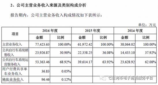 笼统来说,永安行做两块业务,一个是政府公共自行车,一个是共享单车,从营收数据上看,2014年至2016年,永安行公自行车服务收入依次为2.36亿元、3.96亿元和5.34亿元,占比为62.08%、63.92%和68.92%,同期,销售公共自行车系统业务收入为1.44亿、2.23亿和2.39亿元,占比为37.92%、36.08%和30.9%,这两者加起来,2014年到2016年,永安行靠着政府公共自行车获得的营收比例占当年总营收比例为:100%、100%、99.88%,也就是说2014年和2015年永安行就没有通过共享单车有营收,而2016年开展共享单车业务以来的营收也才0.12%而已。