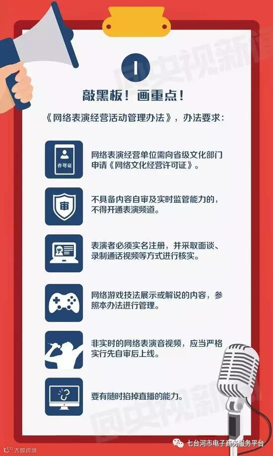 本月12日,文化部印发《网络表演经营活动管理办法》,重拳整治网络直播生态,并将于2017年1月1日起施行。主要内容如下: