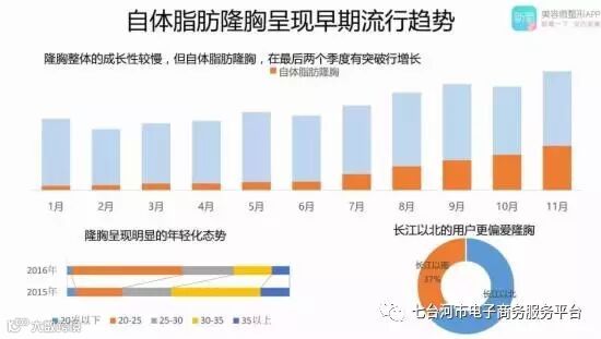 隆胸方面,目前该行业呈现年轻化姿态,且整体增速缓慢。白皮书数据显示,自体脂肪隆胸在最后两个季度有明显增长,2015年隆胸的消费者占比最多的是“30~35岁”年龄段,到了2016年“20~25岁”年龄段则成了隆胸的主流用户。此外,长江以北的用户更偏爱隆胸。长江以南隆胸占比37%,长江以北占比63%。