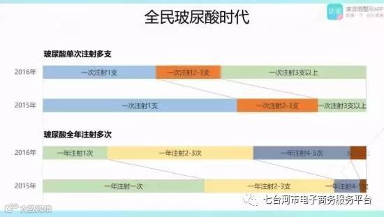而根据该报告的数据,亿邦动力网了解到,在今年,玻尿酸的使用掀起了一个小高峰。2015年,玻尿酸全年注射次数占比最多的是“一年注射一次”,到了2016年,占比最多的则为“一年注射2-3次”;2015年,玻尿酸单次注射支数占比最高的是“一年注射一支,到了2016年,占比最多的则为“一次注射3支以上”。