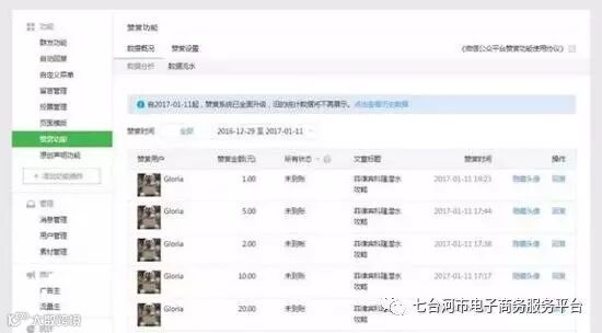 A:从2017年1月11日起,在公众平台后台左侧菜单栏的“赞赏功能”中,点击“数据概况”—“数据流水”,可以查看用户的每一笔赞赏。