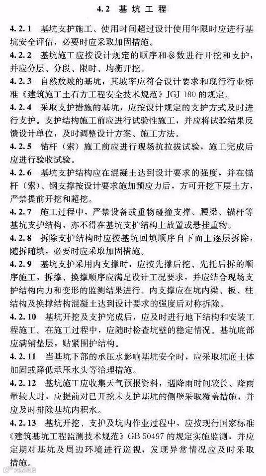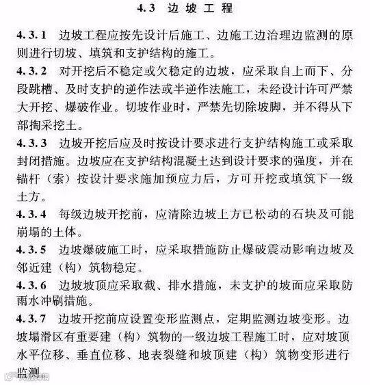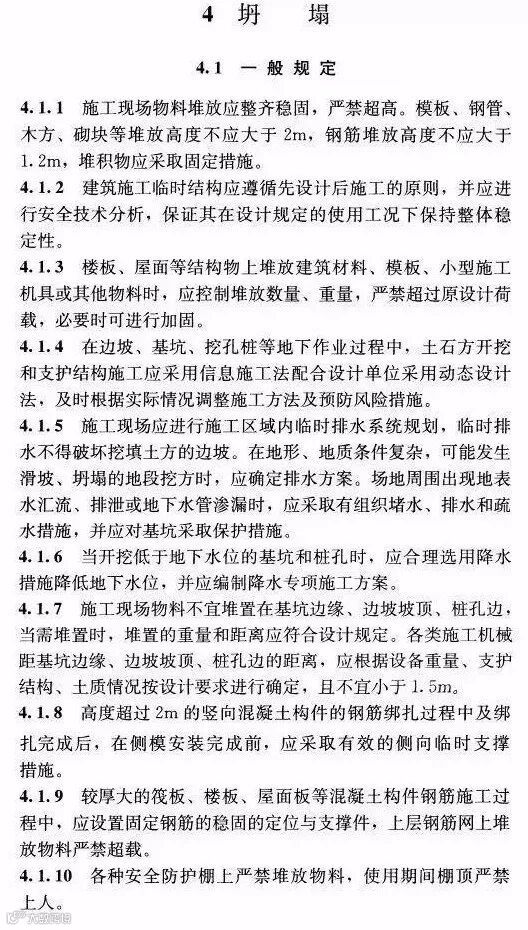 住房城乡建设部行业标准《建筑施工易发事故防治安全标准》(JGJ/T429-2018),规定了建筑施工坍塌、高处坠落、物体打击、机械伤害、触电、起重伤害、其他易发事故(淹溺、冒顶片帮、透水、爆炸和放炮、中毒和窒息)等七类事故的防范技术措施。其中,章节4.1-4.4针对涉及坍塌的土方工程做出了规定。