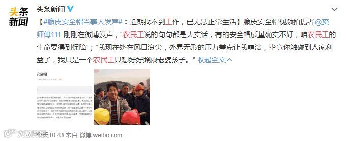 4月11日,一个关于农民工测试安全帽的视频被传得沸沸扬扬,而这个视频的主人公窦师傅却因为这个脆皮安全帽测试视频,丢了工作,回了农村……他无奈表示,以前找他干活的人都说不缺人了,目前已无法正常生活。