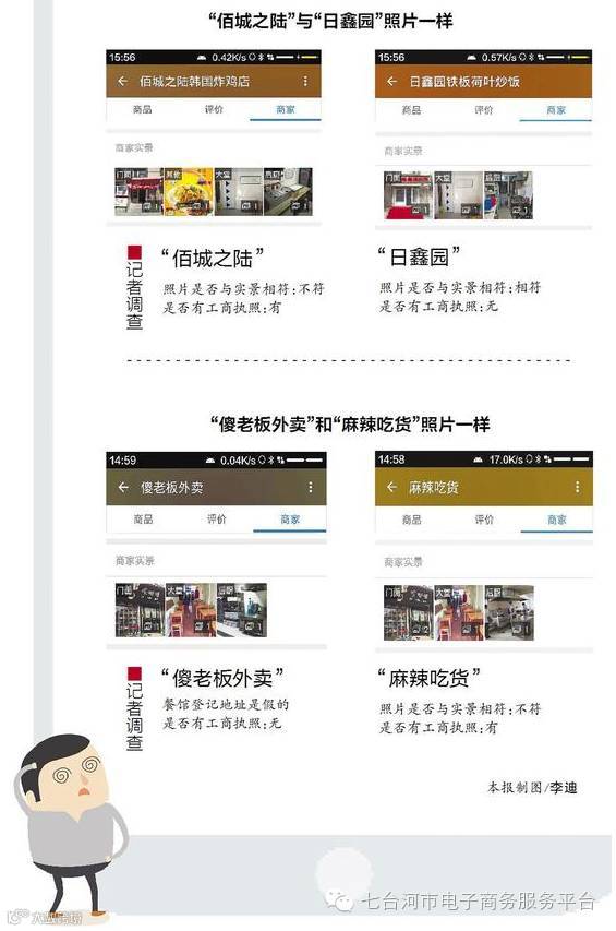 经过几天记者共走访了6家“饿了么”注册商家,除2家有工商登记外,其余4家店都没有相关登记,其中4家店共用大堂和门脸的照片让人真假难辨,1家店完全找不到门店。对此,市民呼吁,网上订餐固然便捷方便,但不能处于监管的真空地带,作为第三方交易平台的“饿了么”该管管这些门店了。(来源:哈尔滨新闻网)