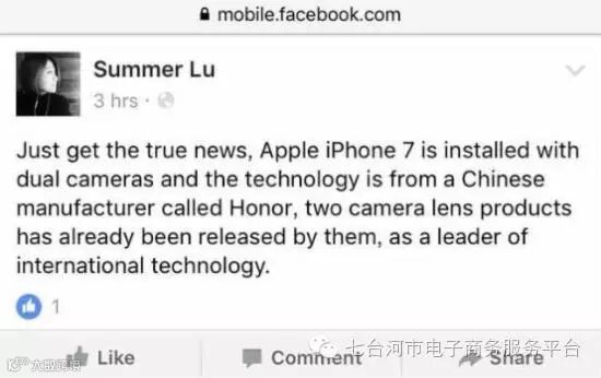 这件事的背景是,此前有爆料称,苹果iPhone 7双摄像头因技术不成熟被将取消,不过近日在facebook上爆料iphone7确定采用双镜头,并提到在技术实现上或参考中国厂商荣耀。作为iPhone7非常重要的亮点之一,双镜头一直被用户所期待。随着,iPhone7双镜头纷争尘埃落定。