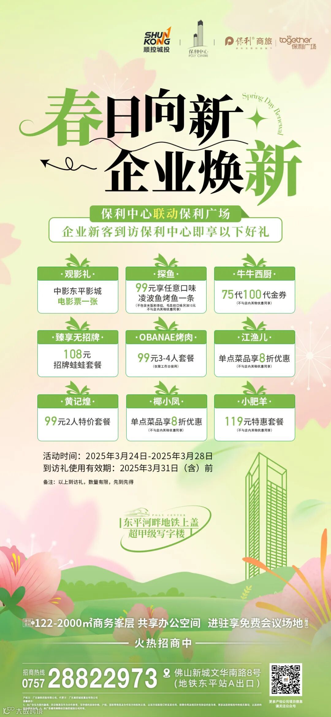 当东平河畔的木棉绽放新红,保利中心联动东平保利广场,以春之名,为城市商务精英呈献一场「商务赋能+生活美学」的双重焕新体验。3月24日至3月28日,凡到访保利中心的企业新客,即可解锁春日到访好礼,让企业焕新与生活仪式感在此交融。