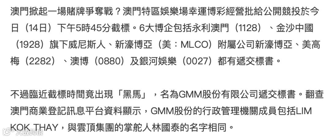 一个新名字GMM股份有限公司,出现在澳门新一轮博彩经营批给公开竞投投标结果名单中,令“赌牌”争夺在变数中正式开始了。