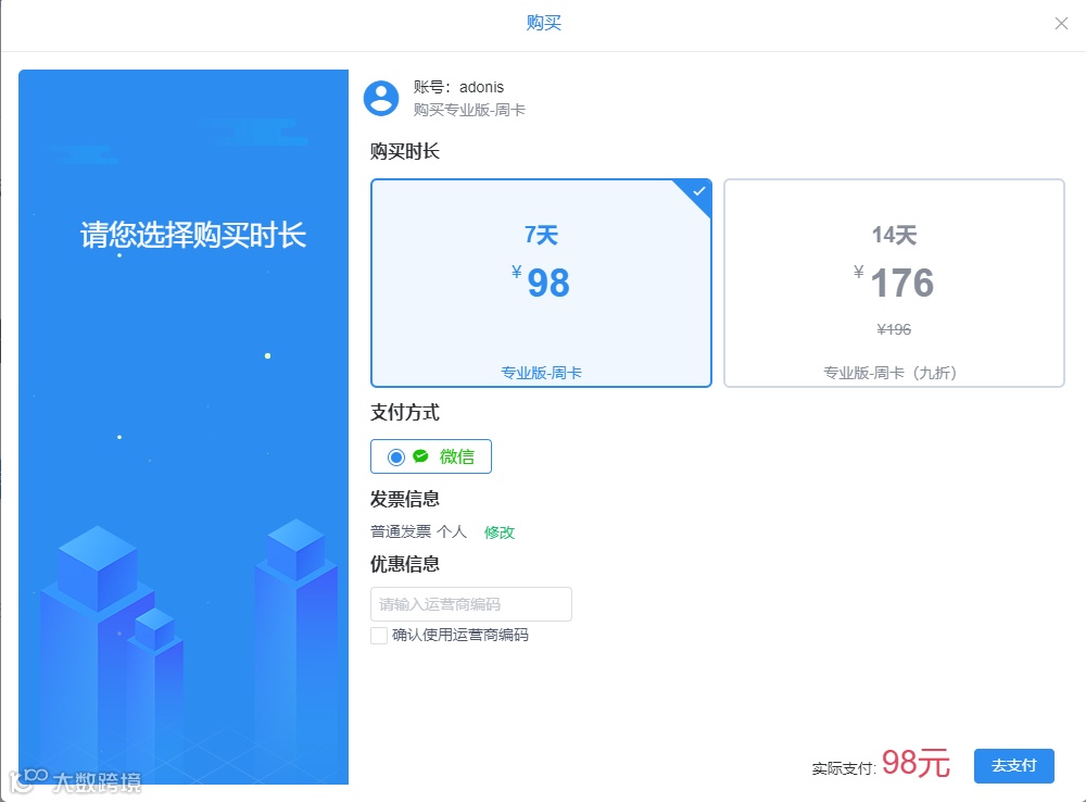 从原来的“专业版2980元/年”产品套餐,增加到了“专业版-周卡98元”、“专业版-月卡360元”、“专业版-季卡990元”、“专业版-年卡2980元”四类产品套餐!