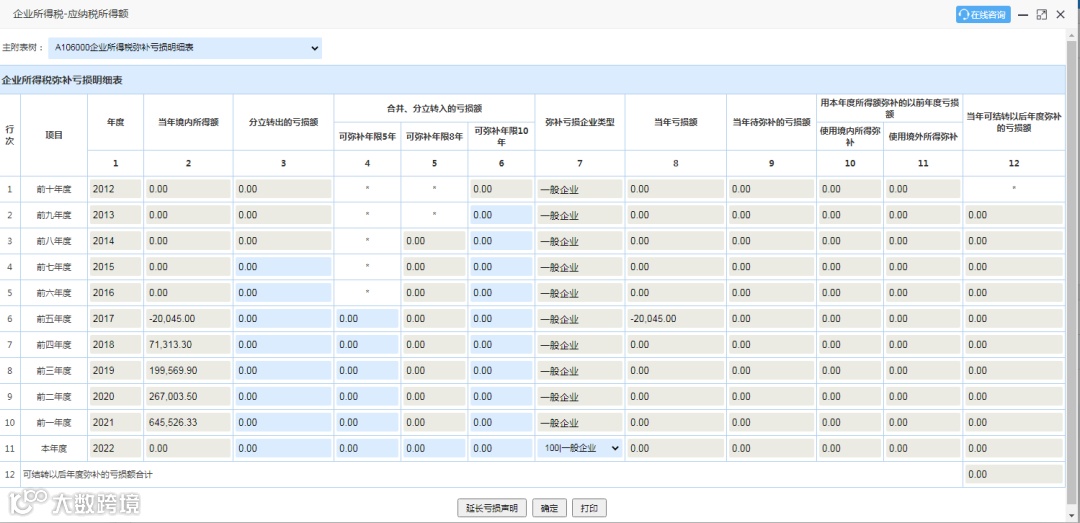 第五步:《企业所得税弥补亏损明细表》(A106000),该表简化了过去弥补亏损表的填报,将弥补亏损计算过程交由信息系统在后台处理,纳税人在申报时,相关数据自动生成(除3、4、5例外),不能修改,11行第1、2、6列根据本年申报情况自动带出,其中第6列“弥补亏损企业类型”根据基础信息表自行判断。