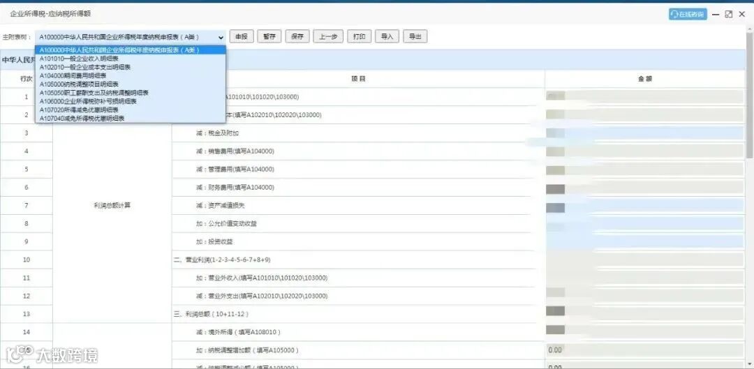 第三步:填写《中华人民共和国企业所得税年度纳税申报表(A类)》(A100000)。