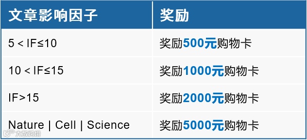 只要您发表的科研论文满足以下条件,即可根据论文发表期刊的影响因子(IF),获得相应价值的等值购物卡奖励: