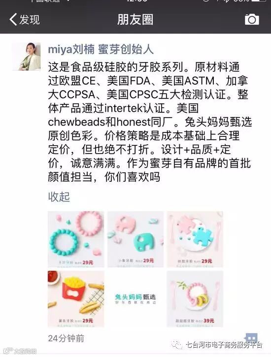 蜜芽创始人刘楠还在朋友圈亲自为自有品牌做宣传。