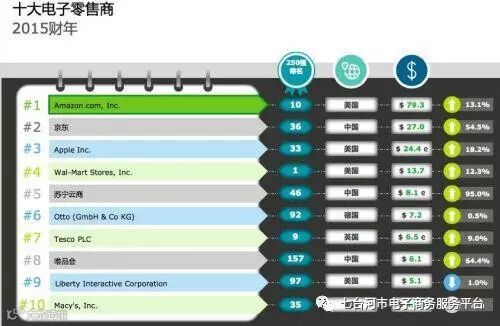 同时,在同期公布的全球50强电商排行榜(Top 50 e-retailers)中,京东以2015财年的270亿美元位列全球第二,第一名是亚马逊。苏宁云商则以2015财年的81亿美元位列全球第五名,唯品会以2015财年的60.84亿美元电商营收跻身全球前十强,位列全球第八。