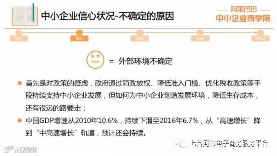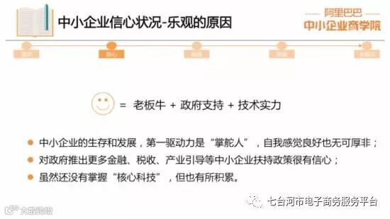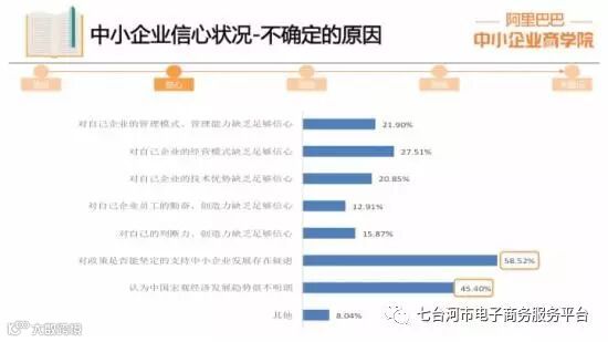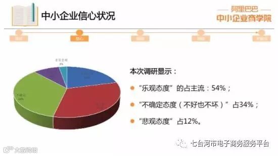 【亿邦动力网讯】4月6日消息,日前,阿里巴巴中小企业商学院对外发布《中小企业生存现状与发展策略》报告。报告分发展现状、信心状况、发展瓶颈、发展策略、发展建议等五个方面。信心状况方面,34%持“不确定态度(不好也不坏)”,12%持“悲观态度”,这表明,有46%的中小企业对未来信心不足。