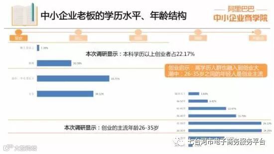 中小企业创业者中,26-35岁之间的年轻人是创业主流,占48.37%;本科学历以上占22.17%,高学历人群也融入到创业大潮中,占1.39%。