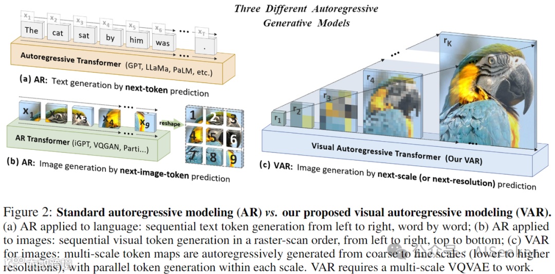 VAR 提出新的图像生成范式:预测下一个尺度/分辨率,这与之前一般的光栅扫描式(从左到右、从上到下)的预测下一个 token 的逻辑不同