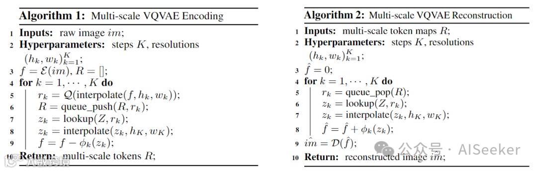 基于多尺度特征恢复特征图 f 后,经过解码器得到重建图像(见 Algorithm 2),再通过重建损失等训练 VQVAE