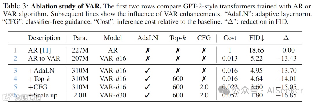 消融实验:通过各种提升技巧,VAR 相比基准的 AR 模型,精度 FID 从 18.65 提升到 1.80,推断速度提升了 20 倍