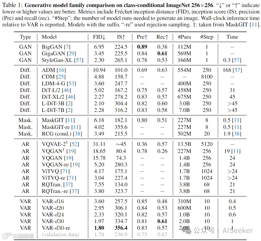 与 SOTA 对比:VAR 的精度相较于其它类型方法更高,速度比扩散模型、自回归模型更快,增大模型参数量能带来精度的提升