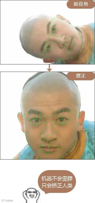 但是呢,由于人脸会以各种各样的姿态出现,如果保持“歪着”的原样,机器进行下一步的工作就会比较麻烦,所以在这里就还需要把人脸统一摆正,消除因为姿势不一致而带来的误差。